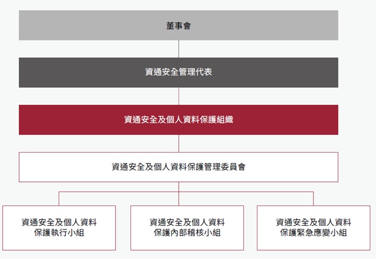 本公司於民國113年成立「資通安全及個人資料保護管理委員會」,負責執行資訊作業安全管理規劃,建置與維護資訊安全管理體系,統籌資訊安全及保護相關政策制定、執行、風險管理與遵循度查核。由總經理擔任督導暨資訊安全長,公司內各單位(包含營業、財務、會計、採購、物流、行銷、顧服、法務、人資、資訊等)主管均為委員會成員。