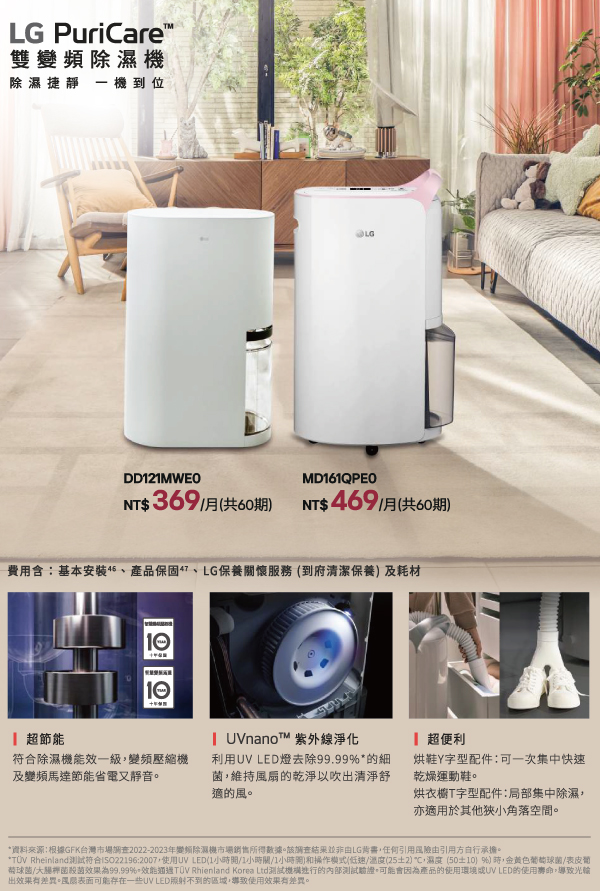 1.壓縮機、馬達雙變頻,除濕能效一級