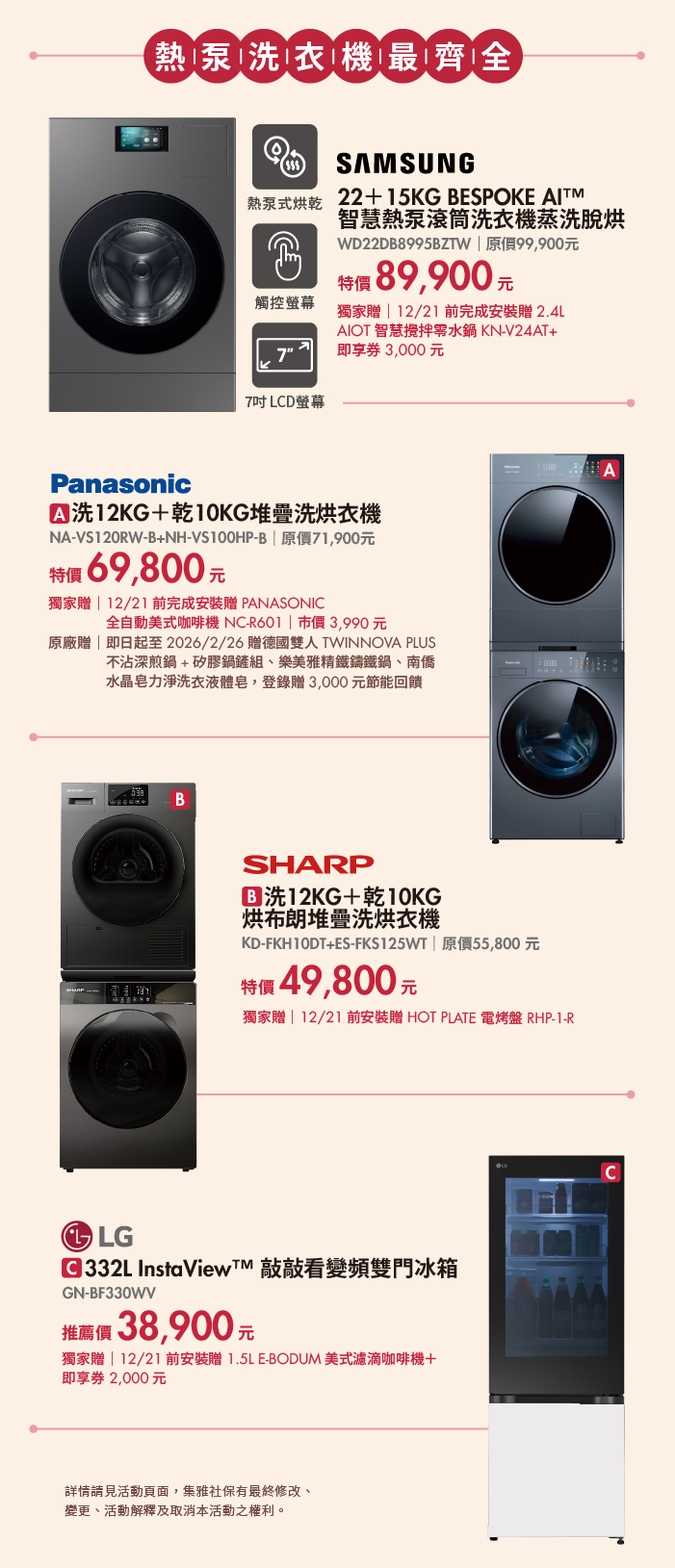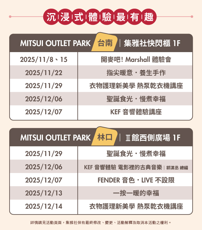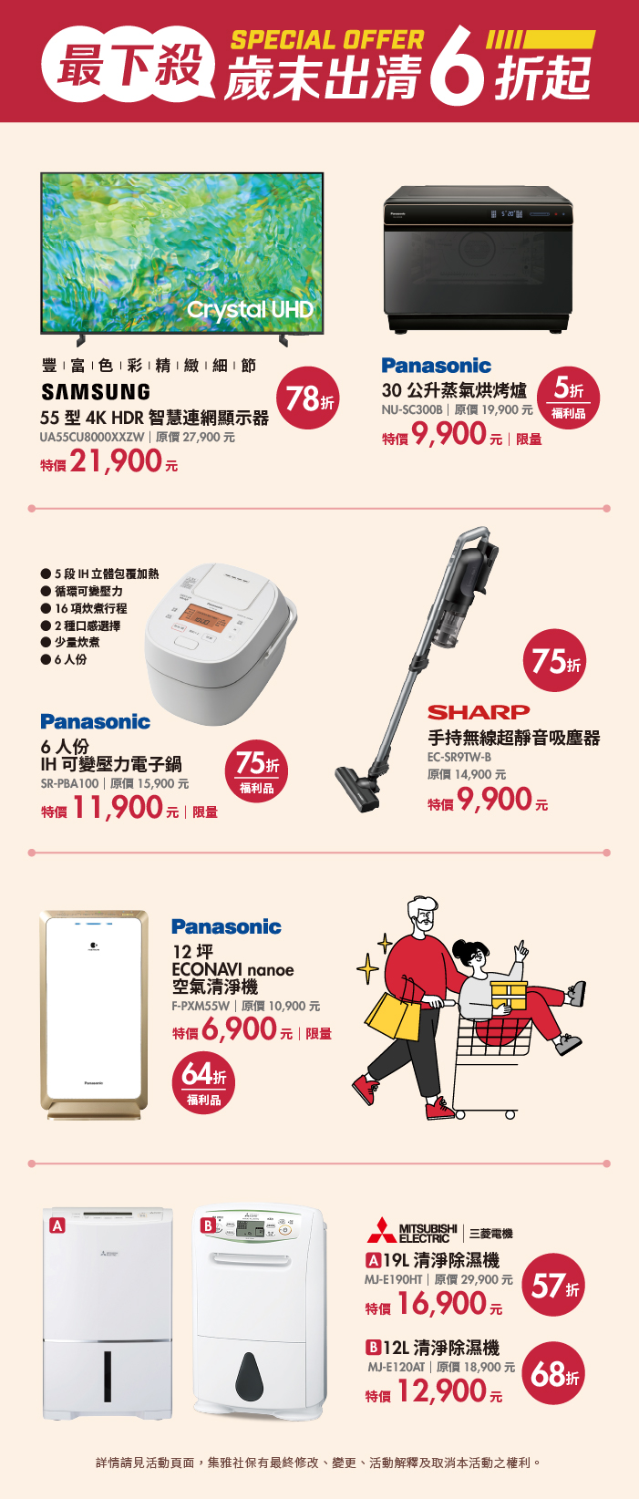 年終購物最強檔來了!集雅社於台南三井/林口三井Outlet舉辦「智選幸福時刻 出清家電6折起」,精選智慧家電、影音設備、小家電與熱泵洗衣機,限時優惠最低6折起。