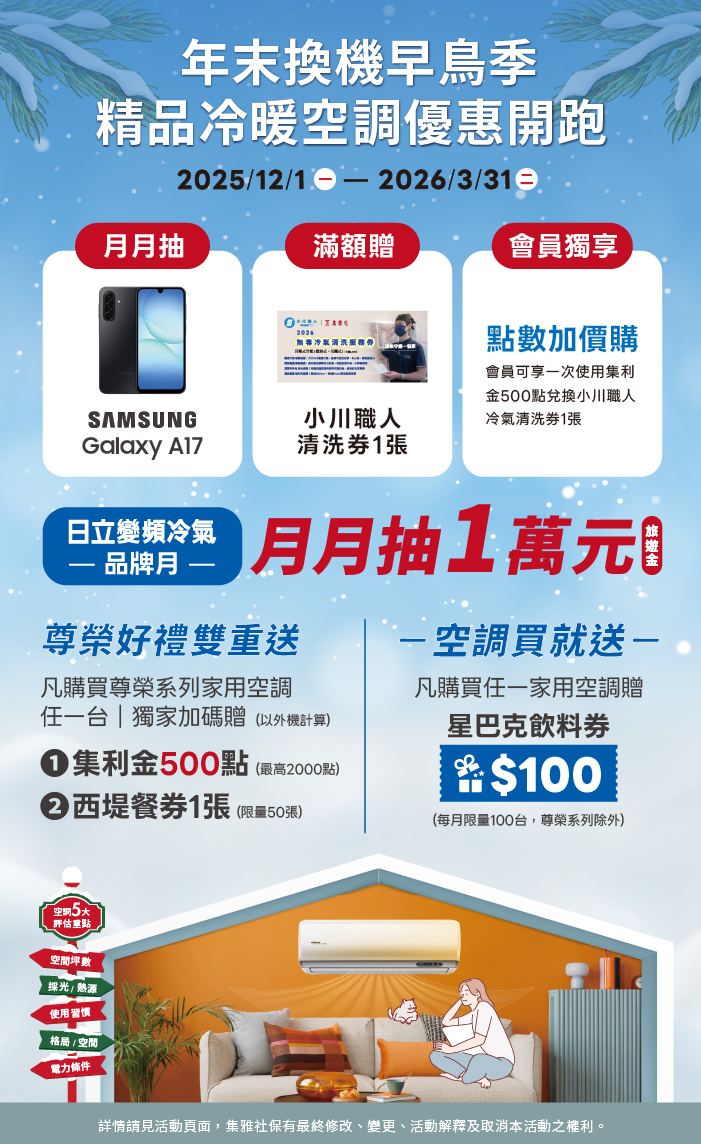 活動方式: 購買指定組合並完成安裝即贈對應集利金;若「追劇、大掃除、洗碗機、年末換機」四種組合皆購買,加碼再贈 1,688 點 集利金。