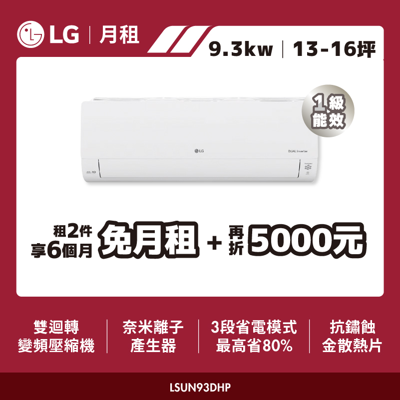 【LG月租】13-16坪 DUALCOOL WiFi 雙迴轉變頻空調 - 旗艦冷暖型9.3kw|LSUN93DHP