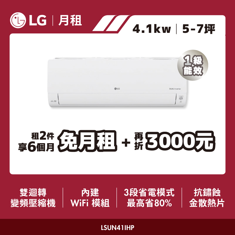 【LG月租】5-7坪 DUALCOOL WiFi 雙迴轉變頻空調 - 經典冷暖型4.1kW|LSUN41IHP